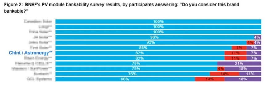 據(jù)悉,今年彭博新能源財經(jīng)(BNEF)的調(diào)研涉及機(jī)構(gòu)融資的光伏項目裝機(jī)量涵蓋全球557GW。收集了來自全球28家銀行、基金、太陽能工程承包商、獨(dú)立發(fā)電廠商和技術(shù)顧問的調(diào)查結(jié)果,并與質(zhì)量檢測及技術(shù)專家進(jìn)行深度訪談后得出的結(jié)果。該報告是以公司的財務(wù)健康狀況、光伏組件和逆變器在項目上的跟蹤數(shù)據(jù)以及制造廠商的質(zhì)保為重要評估指標(biāo)。調(diào)查覆蓋范圍廣,評估公開透明,是眾多金融機(jī)構(gòu)在商業(yè)信貸方面的重要參考依據(jù)。