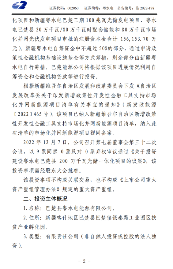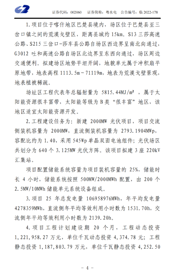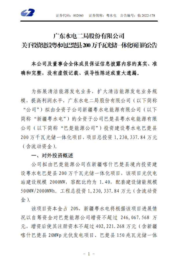 12月7日,粵水電發布公告稱,公司擬由巴楚能源公司在新疆喀什巴楚縣境內投資建設粵水電巴楚縣200萬千瓦光儲一體化項目,該項目光伏電站建設規模2000MW,容配比約為1.40,配套建設儲能規模500MW/2000MWh。工程總投資1,230,337.84萬元(含流動資金),項目工程計劃建設期20個月。