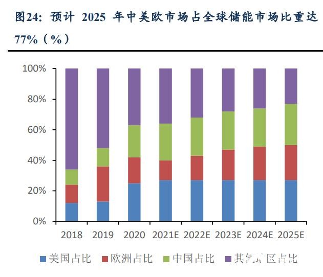 海外市場率先迸發,公共項目與戶用需求共振。國內外多國實行了多項推動、鼓勵 儲能發展的政策。2017-2021 年受益于電價定價體系、能源結構的差異性以及政府給予 適當補貼,國內外儲能發展迅速。2020 年美國儲能市場迸發,成為全球第三大儲能市場, 公共事業儲能項目集中落地,是 2021-2024 年的重要增量,同時電力供應不穩定刺激戶 用儲能需求,我們預計 2030 年美國新增儲能需求將達 138GW/ 441GWh。歐洲 2019 年 開啟儲能元年,2020 年再創新高,躍居全球累計儲能的最大市場,其中德英領跑,德國 是全球最大戶用儲能市場,主要是居民電價高企及補貼政策轉向家用儲能所致,預計 2030 年歐洲儲能需求達 131GW/394GWh。預計到 2025 年全球新增儲能裝機達到 131GW/318GWh,2021-2025 年復合增速為 79%,中國美國歐洲將是最大增量市場。