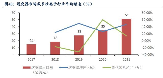 逆變器市場成長性高于行業平均增速。在全球光伏產業大發展的推動下,光伏逆變 器市場近年來保持了較快的發展態勢。2017 年以來全球光伏逆變器出貨量快速上漲,出 口額從 2017 年的 15 億美元上升到 2021 年的 51 億美元,年復合增長率達到 35.9%。逆 變器成長性高于光伏行業平均增速。