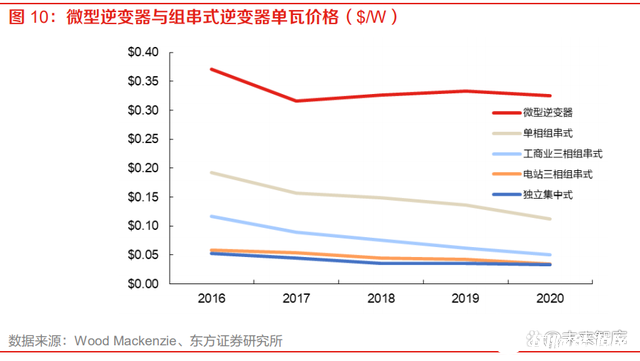 價格劣勢:產品細分顆粒度相對較細,歷史維度單瓦價格處于高位。據 Wood Mackenzie 統計數 據,2016-2020 微型逆變器單瓦售價相較組串式逆變器仍較高,處于 0.3-0.4$/W 單位價格區間, 相較各應用場景組串式逆變器 0.05-0.15$/W 價格水平仍有較明顯價差。但隨著微型逆變器行業技 術迭代后,微型逆變器多體架構持續滲透,其單瓦 售價有望觸及 0.1$/W 水平。雖短期仍無法相較組串逆變器展現出直接價格優勢,但基于對分布式 光伏發電系統中直流高壓風險的重視,導致對光伏發電系統“組件級控制”的要求趨嚴,以及其 對發電量的提升,微型逆變器于分布式市場中的滲透率后續有望提升。