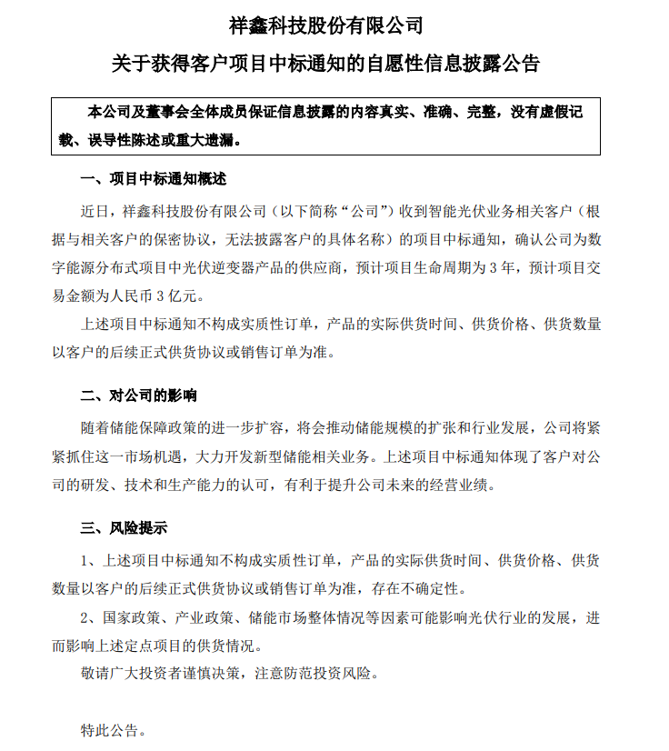 國(guó)際能源網(wǎng)/光伏頭條獲悉,6月1日祥鑫科技發(fā)布公告,近日,公司收到智能光伏業(yè)務(wù)相關(guān)客戶(根據(jù)與相關(guān)客戶的保密協(xié)議,無(wú)法披露客戶的具體名稱)的項(xiàng)目中標(biāo)通知,確認(rèn)公司為數(shù)字能源分布式項(xiàng)目中光伏逆變器產(chǎn)品的供應(yīng)商,預(yù)計(jì)項(xiàng)目生命周期為3年,預(yù)計(jì)項(xiàng)目交易金額為人民幣3億元。
