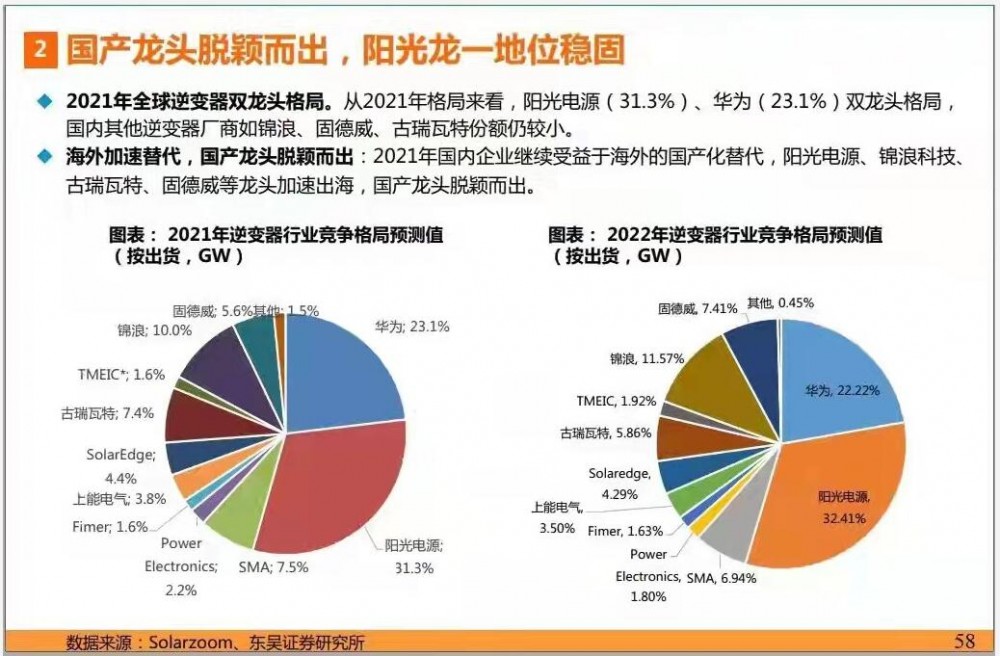 經(jīng)過多年大浪淘沙式的行業(yè)洗牌后,馬太效應(yīng)凸顯,2021年全球逆變器呈現(xiàn)雙龍頭格局。從2021年格局來看,陽光電源占據(jù)31.3%的市場,而華為占據(jù)23.1%。
