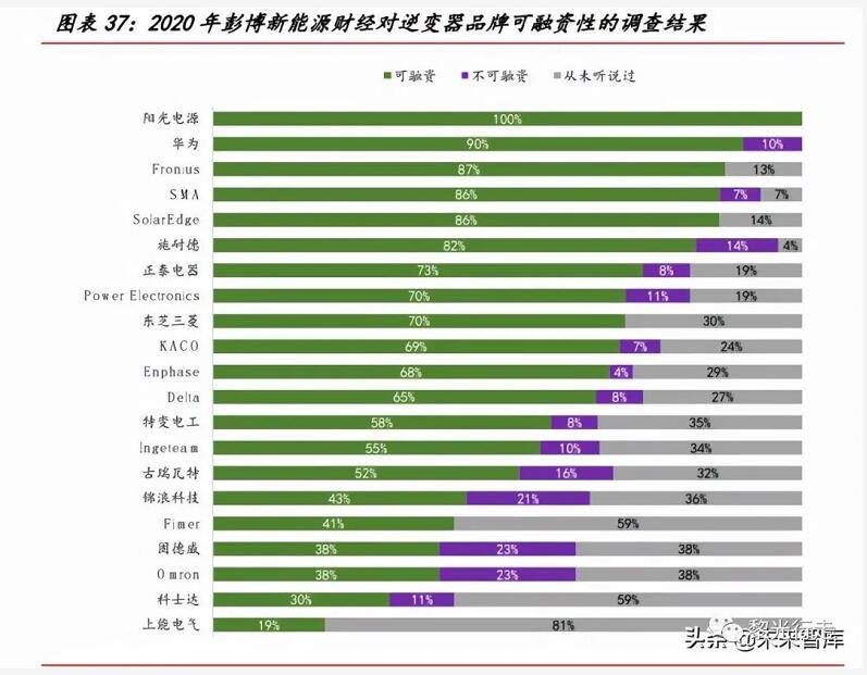 2020年彭博新能源財經(jīng)通過向可再生能源項目的投資方發(fā)放問卷等形式,對逆變器品牌的可融資性進行了調(diào)查。排名較高的品牌意味著更易幫助項目開發(fā)商獲得銀行融資,利于綁定長期客戶群體;另一方面說明該品牌逆變器在產(chǎn)品質(zhì)量、運行表現(xiàn)、售后服務(wù)支持和長期可靠性方面表現(xiàn)突出,利于海外布局的拓展。陽光電源以100%的得票率當(dāng)選“全球最具融資價值的逆變器品牌”,華為位居第2名,共有9家中國企業(yè)上榜。重要的是,該調(diào)查結(jié)果展現(xiàn)出國內(nèi)逆變器企業(yè)在海外擴張業(yè)務(wù)的過程中,品牌價值得到提升,逐步得到海外投資方的認(rèn)可。