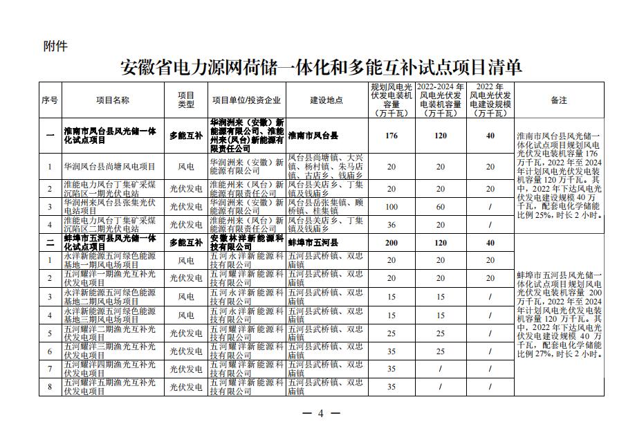 淮南市風臺縣風光儲一體化試點項目規劃風電光伏發電裝機容量176萬千瓦,2022年至2024年計劃風電光伏發電裝機容量120萬千瓦。其中,2022年下達風電光伏發電建設規模40萬千瓦,配套電化學儲能比例25%,時長2小時。