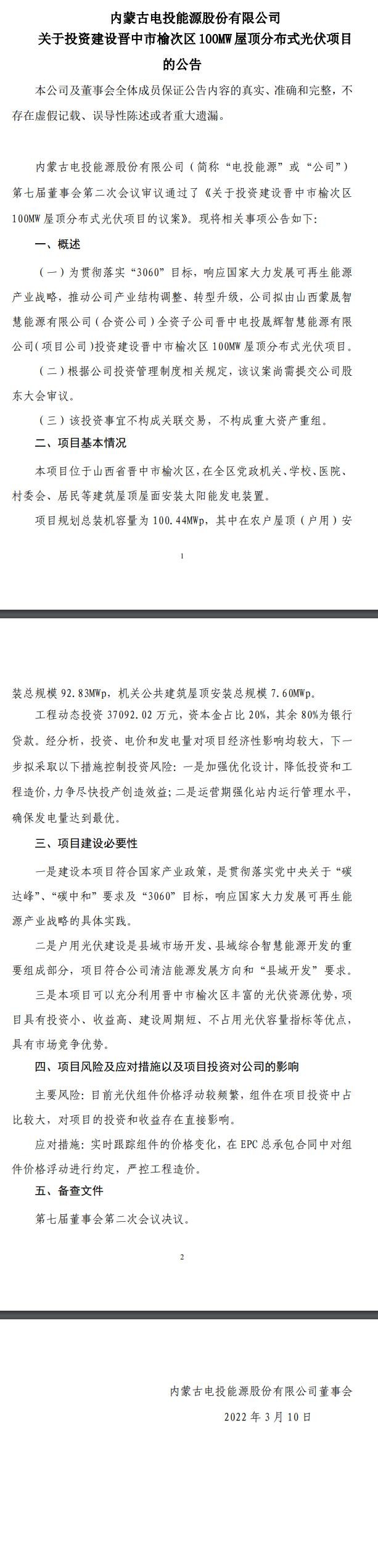【國(guó)際能源網(wǎng) 訊】3月11日,內(nèi)蒙古電投能源股份有限公司發(fā)布《關(guān)于投資建設(shè)晉中市榆次區(qū)100MW屋頂分布式光伏項(xiàng)目的公告》,披露該公司擬由山西蒙晟智慧能源有限公司(合資公司)全資子公司晉中電投晟輝智慧能源有限公司(項(xiàng)目公司)投資建設(shè)晉中市榆次區(qū)100MW屋頂分布式光伏項(xiàng)目。