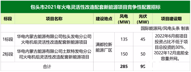 包頭市2021年火電靈活性改造配套新能源項(xiàng)目競爭性配置共有2個標(biāo)段同時招標(biāo),總規(guī)模為38萬千瓦。其中: