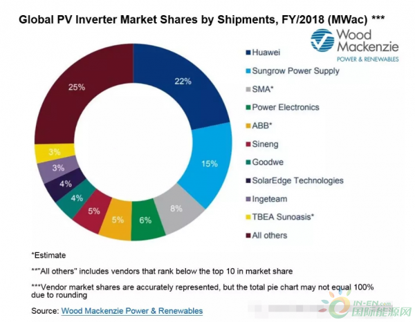 自2013年以來,五大光伏逆變器廠商每年度的市場份額不斷增加,但2018年出現了反轉。據Wood Mackenzie電力與可再生能源統計,2018年,全球前五大逆變器供應商的市場份額總和下降,由原先的62%降至56%。 前五大廠商的市場份被排名6至10位的企業所瓜分,后五家企業的市場份額總和從15%增加至19%。 自2012年起開始追蹤逆變器市場份額,陽光電源和SMA每年都在全球光伏逆變器市場的領導者之列。華為在2018年連續第四年位居全球榜首。 因2018年5月中國光伏市場政策調整,華為的全球市場份額在2018年下降了4個百分點,其它多數中國供應商也受到不同程度的沖擊。 按2018年全年發貨(MWac)的全球光伏逆變器市場份額