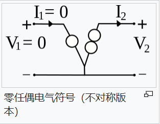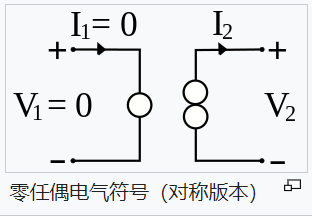 零任偶(nullor)是一種理想的二端口網(wǎng)絡(luò),輸入端為零極子,輸出端為任意子,零任偶類似一個理想的放大器,其電壓增益、電流增益、跨導(dǎo)增益和跨阻抗(transimpedance)增益都是無限大。其傳輸參數(shù)都為0,也就是說,其輸入-輸出關(guān)系可以用以下的矩陣方程式表示。