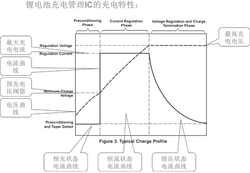 有上圖可以看出,鋰電池充電電流和電壓是動(dòng)態(tài)變化的,這是由鋰電池本身的化學(xué)物質(zhì)決定的。所以需要根據(jù)鋰電池本身的充電特性來(lái)配置充電IC的性能,以達(dá)到正確,安全,高效的使用鋰電池。日常表述中的“鋰電池充電電流”是針對(duì)鋰電池在充電過(guò)程中所處快速充電階段的充電電流而言的,作為一個(gè)動(dòng)態(tài)的過(guò)程,鋰電池最理想充電電流實(shí)際上是分為三個(gè)階段的。常用鋰電池充電IC如TP4012A、TP8052、TP8056,本文最后處有部分介紹。