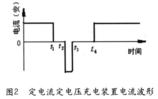 地方上已有這種充電設備,其工作過程是三相交流電源經(jīng)接觸器、變壓器及可控硅充電開關(guān)對蓄電池充電。待蓄電池電壓達到出氣點電壓時,經(jīng)過電壓傳感器檢測并發(fā)出信號。此信號使充、放電狀態(tài)控制器轉(zhuǎn)為停止充電狀態(tài),并發(fā)出三個控制信號。第一個控制信號是關(guān)斷充電脈沖發(fā)生器的信號。第二控制信號是開始去極化信號,它經(jīng)過放電前停止充電延時電路延時(t1-t2)后,發(fā)出放電開始脈沖,打開放電開關(guān),蓄電池開始向放電電阻放電并經(jīng)過放電延時電路延時(t2- t3)后,發(fā)出放電關(guān)脈沖,結(jié)束放電。依次重復進行充放電過程,直至充電結(jié)束。第三個控制信號送給開始放電計時器,使其從第一次去極化放電開始計時,到預定的時間后結(jié)束充電,自動關(guān)機。用這種方法充電,蓄電池的充電和放電電流波形如圖2所示。上述兩種方法是蓄電池充電方法的改進方向。我國采用的快速充電方案很多,性能差異很大。各種充電方法對蓄電池的壽命影響也大不相同。這兩種方法在理論上比較適合對蓄電池充電的要求。
