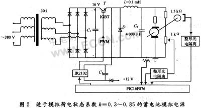 上面討論的是荷電狀態(tài)系數(shù)k=0.3~0.85所對應(yīng)的情況,在這一區(qū)間內(nèi),可認(rèn)為蓄電池的內(nèi)阻Ri是常數(shù)。對于k<0.3的情況,隨k值的下降,內(nèi)阻Ri會(huì)急劇上升。這一狀態(tài)也可由模擬電源近似模擬:使開關(guān)管T1的PWM脈寬隨k值一起下降,一方面造成電壓的下降,同時(shí)由于也使整個(gè)線路的開關(guān)損耗增大,這相當(dāng)于增加了蓄電池的內(nèi)阻。不過這樣得到的Ri值與蓄電池的實(shí)際內(nèi)阻可能有相當(dāng)?shù)牟罹啵虼薻<0.3的情況不適宜使用。