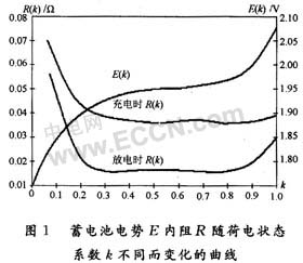 蓄電池的電勢E、內(nèi)阻Ri與電池的荷電狀態(tài)有關(guān)。荷電以系數(shù)k表示,其值在0~1之間,0代表未荷電,1代表滿荷電。隨荷電系數(shù)k由0上升,蓄電池電勢非線性地增大,內(nèi)阻Ri則呈現(xiàn)先下降最后又略有升高的形狀,如圖1所示。由圖1可見,蓄電池內(nèi)阻Ri的充、放電曲線亦有差別。起動(dòng)機(jī)每起動(dòng)一次,荷電狀態(tài)系數(shù)k均會(huì)下降百分之幾,變化量很小;而蓄電池電勢E(k)的變化則視k之值而異。當(dāng)k在0.3~0.85范圍內(nèi)時(shí),起動(dòng)機(jī)每起動(dòng)一次E(k) 變化很小,接近恒值,但當(dāng)k>0.85和k<0.3時(shí),隨k值的小變化,E(k)變化較為明顯。在設(shè)計(jì)蓄電池模擬電源控制軟件時(shí)應(yīng)予以考慮。