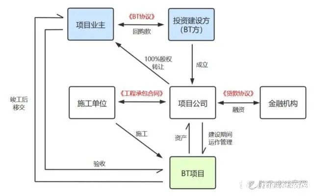 建設-轉讓(Built-Transfer)模式:BT模式是PPP制度下BOT(Build-Operate-Transfer)模式的一種變形,投資建設方(即BT方)以全額墊資的方式建設項目,建成后移交項目業主(即項目發起人),業主分期付款償還項目投資和回報。